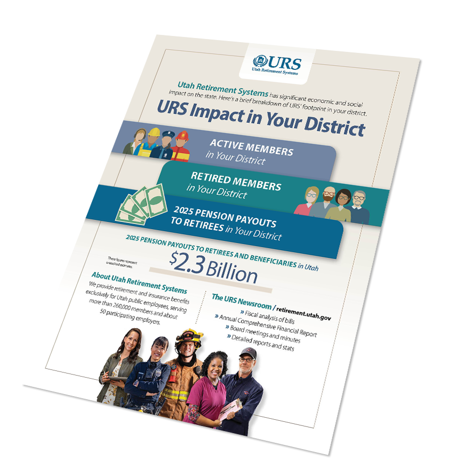 URS has a significant economic and social impact on the state. We provide retirement and insurance benefits to more than 260,000 Utah public employees and retirees and about 500 participating employers. In 2025 alone we paid more than $2.3 billion to retirees in Utah. Click below to see URS' impact in your House, Senate, and Congressional district in 2025.